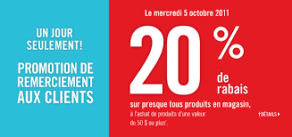 Pour une journée seulement (mardi le 2 octobre), Pharmaprix offre un rabais de 20% à l'achat de 50$ ou plus de produits à prix courant. Vous n'avez qu'à présenter le